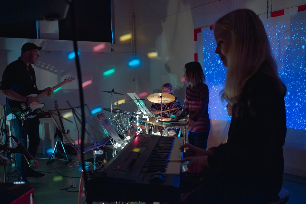Rytmisk sammenspil, tromme/rytme-værksted, indspille sang/historie, skrive sange,