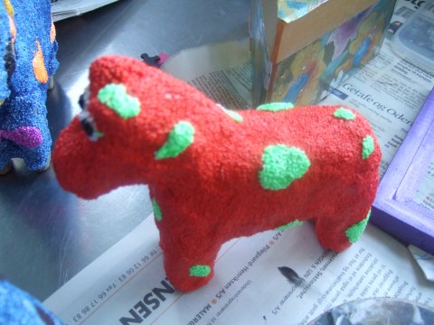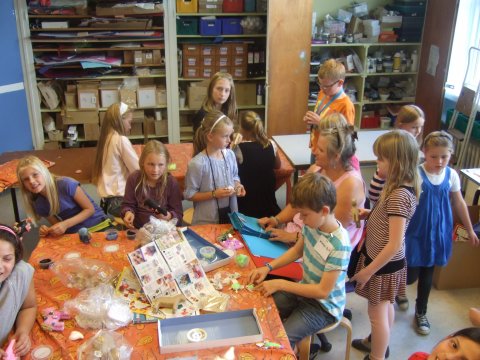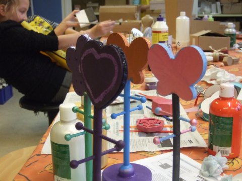 Der males på glas, porcelæn, lærreder, ting af pap og træ. Vi modellerer af forskellige materialer, vi laver smykker, støber i gips, laver våd- og nåle filtning, støber sæbe og andre plejeprodukter, laver bolsjer, strikker, farver tørklæder og t- shirts og vi klipper og klistre.